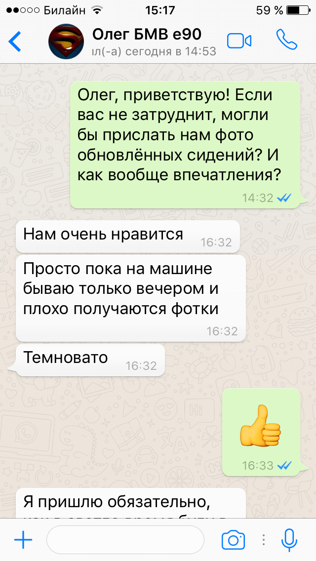 1) Владелец приехал на автомобиле, выбрал материалы и цвет нитки строчки. Оставил все сиденья кроме водительского и уехал.